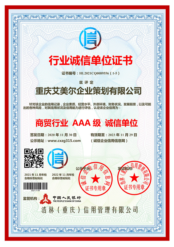 重庆PA直营企业策划有限公司被被评级为行业诚信单位,艾美策划核心策划项目:重庆企业策划,重庆企业策划公司,重庆招商策划,重庆企业宣传片,企业VI设计,商业计划书,艾美受托 使命必达。