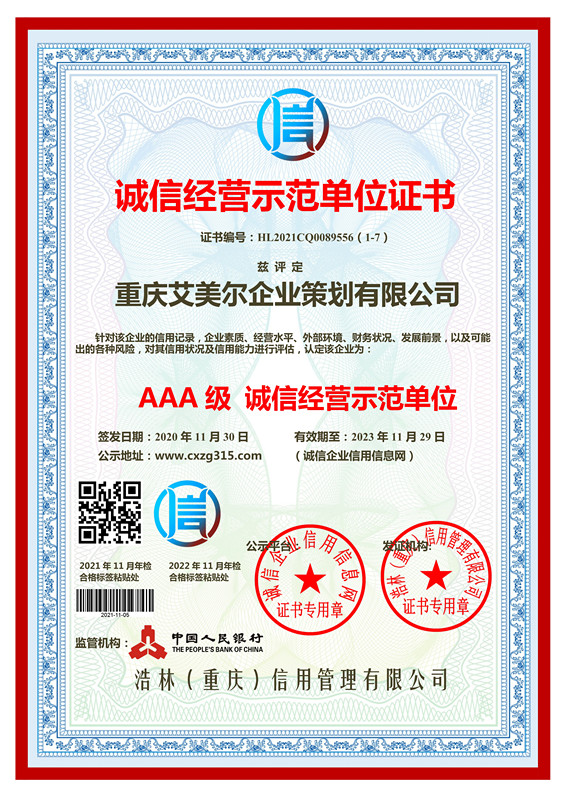 重庆PA直营企业策划有限公司被评级为诚信经营示范单位,艾美策划核心策划项目:重庆企业策划,重庆企业策划公司,重庆招商策划,重庆企业宣传片,企业VI设计,商业计划书,艾美受托 使命必达。